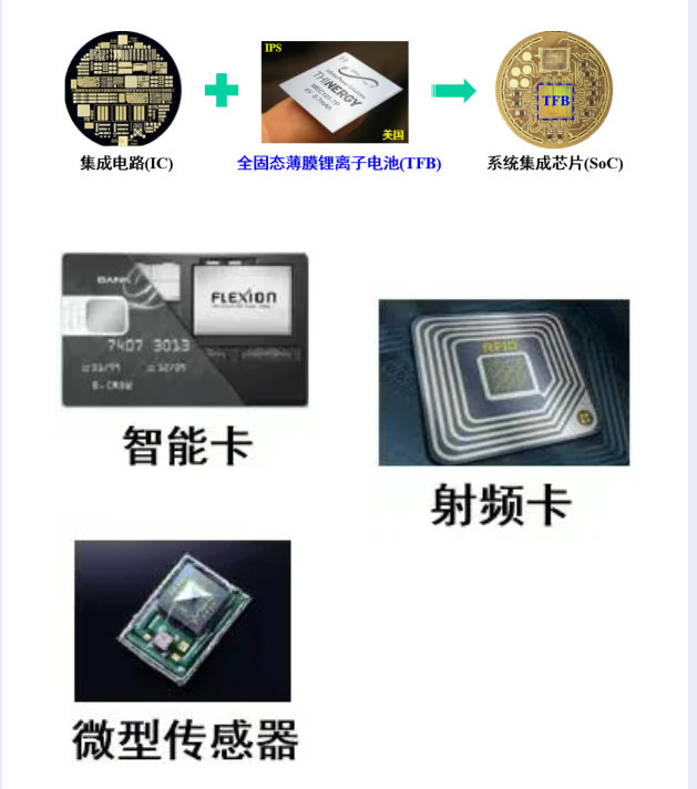 通过集成制备IC与全固态薄膜锂离子电池(TFB)所构成的系统集合芯片(SoC),在微机电系统和物联网等电子信息领域具有广阔的应用前景。TFB广泛地应用于微型传感器、智能卡、射频卡等多方面。